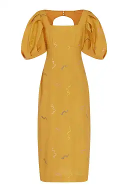 Dress with puff sleeves and keyhole back. Column silhouette. Square neckline. Keyhole back. Puff sleeves. Squiggle embroidery. Button fastening and invisible zip at back opening. Fully lined.