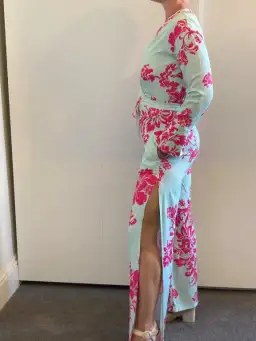 Showcasing a statement pink print, this jumpsuit flows easily through a long sleeve wrap-style bodice, to a full length wide leg trouser, with a deep split to the thigh at each side.