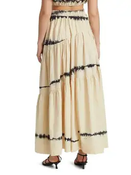 This skirt with tie-dye stripes features an asymmetric tiered design with a drawstring through the waist and falls to above the ankle.