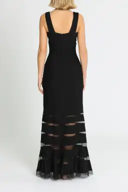 This elegant Tadashi Shoji gown combines classic and modern elements, featuring a sweetheart neckline and sheer panels on the skirt for a subtle skin reveal. The stretch jersey ribbed fabric hugs the curves, accentuating the figure. The dress is completed with a hidden back zip closure and a straight back detail, making it a perfect choice to rent for a masquerade ball or black-tie event.