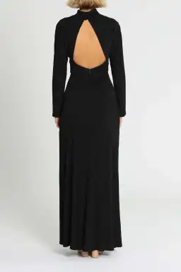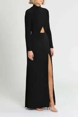 Prepare to make a statement with the Seneca Gown by Tadashi Shoji! This striking black gown, crafted from pintucked jersey, is designed to catch attention. It showcases a high neckline and form-fitting long sleeves. The bodice adds a touch of allure with a stylish cutout, and the gown gracefully flows into a floor-length skirt with a thigh-high side slit. It's the epitome of sophistication and elegance, making it the perfect choice for your upcoming black-tie or evening event.
