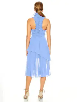 Designed with a chic high neck and intricately beautiful pleated frill detailing, which cascades down a racer-style back and around the armholes. Fitting closely on the bodice, the dress features a removable pleated belt, flaring out elegantly to an asymmetrical layered skirt with pleats. The piece falls gently past the knee.
