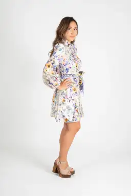 From Spring 2023 Collection, Wonderland. A linen mini dress featuring a stand collar, self-cover buttons, blouson sleeves and a contrast silk waist tie.