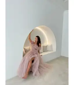 A strikingly glamorous gown with a daring edge. Featuring a structured corset bodice and sensual open back, the design is framed by dropped shoulders in finely pleated tulle. The dramatic full skirt flows into a sweeping silhouette, finished with a thigh-high slit for an alluring touch.