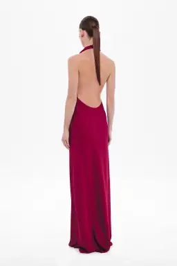 The Donna Satin Dress features a plunging neckline that gathers at the waist with a bespoke metallic ring, creating a softly draped silhouette that flatters the form. The open back adds a touch of modern sensuality, while the satin fabrication catches the light with every movement. Finished with a clean hem and minimalist lines.