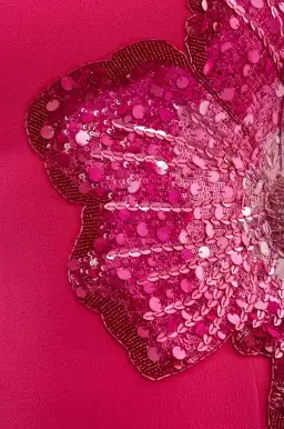An eye catching dress that combines a unique hand embellished floral sequin applique design with timeless elegance. Voluminous short puff sleeves and a rounded neckline effortlessly complement the fitted bodice, enhanced by princess seams that accentuate the feminine pencil skirt silhouette.
