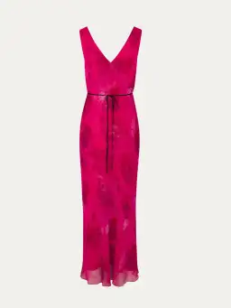 Hot fuchsia pink roses on top, with a pop of red silk lining underneath…The Marie is here. Pure silk, with a contrast black tie at the back to pull you in at the waist, straps just wide enough to conceal your bra and the perfect deep V-neckline to reveal the right amount of décolletage. Length - she's hitting at the right spot. For those with a taste for the 90’s, pair her with your best boot, or for the more fem ladies, a high high heel is the way to go.