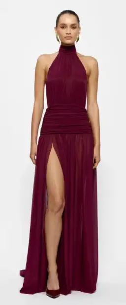 The Verity Gown exudes a sophisticated fusion of vintage elegance and sensual grace. Made from luxuriously soft, buttery mesh, it gently cascades and contours to the figure. Designed to enhance the female silhouette, this gown features a halter neckline flowing into a flowing full-length maxi skirt. The bodice is expertly adorned with ruching and textured detailing, complemented by a stunning open back and a dramatic plunging train that trails gracefully. Slightly sheer by design, the Verity Gown is crafted as a timeless piece intended to be cherished for years. The model stands 5'9" and wears a size XS.