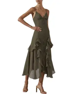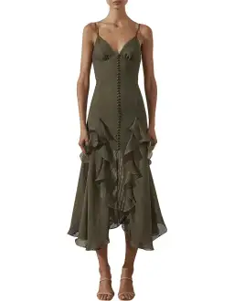 - Textured semi-sheer stripe- Adjustable spaghetti straps- Plunged neckline- Gathered bust detail- Decorative front button tab- Invisible back zip- Contour panel lines with ruffle detail- Midi length skirt with front hem split- Light weight, non-stretchy woven