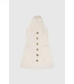 The Irida Vest Dress is the perfect day to night mini. A halter neck style vest dress, with custom made swirl gold buttons to add a little Wolf Gang flair.