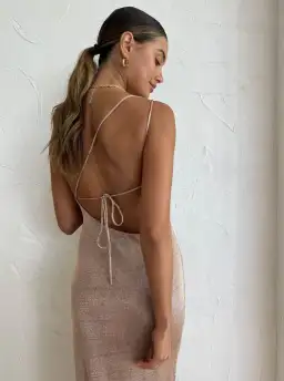 Crafted from a semi-sheer mid-weight Lurex Blend in Silver. This slip drapes over the body with a cowl neckline and asymmetrical back tie closure.