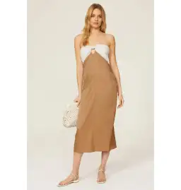 The Off-White and Tan Lets Split Slip Dress elevates the timeless slip dress style with its unique color blocking. Made from Third Form's high-quality cupro blend, this dress seamlessly combines an elegantly knotted halter neck bodice with a delicate skirt, adding a touch of edge to its overall elegance.