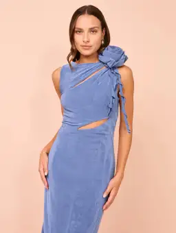 Crafted from a soft slinky jersey fabrication, this maxi dress features a unique florette rose neckline detail and diagonal cut-outs at the neck and waist.