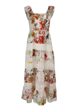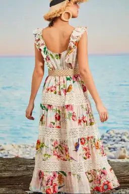 Designed in the 'Sing It All To Me' linen silk print, summer's heating up in this 'A Summer Romance' dress. Featuring a romantic shoulder frill that extends to the waistline and tiered skirt with lace inserts, this wardrobe essential will prove eternally faithful as a staple piece.• Frill detail• Lace panel detailing• Fitted Bodice• Centre back invisible zip• Fully lined