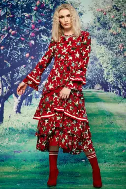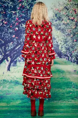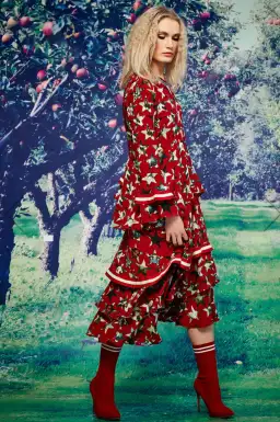 Shine bright like a star in the ‘Flounce Up My Life’ dress. Rich coloured printed crepe de chine falls from the shoulders in a tiered fashion to a mid-leg length. Flared sleeves and contrasting striped trims complete this one of a kind piece!