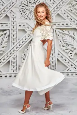 The "Dance with Somebody Dress" by Trelise Cooper is a white midi-length dress featuring a sheer, floral-embroidered bodice and a flowing skirt. The top portion has a round neckline and short sleeves, while the back is open, exposing the mid-back area. The skirt is a simple, A-line shape, ending around the mid-calf.