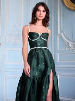 Introducing The Lucetta Dress! She's a dreamy corset gown featuring beautifully gathered cups and gathered skirt tiers. She flaunts a side-front slit, invisible zipper, and side-pockets! She's made from our Emerald Baroque Floral brocade, which features emerald flowers on an emerald background. She's elegant, sophisticated, and a timeless treasure.