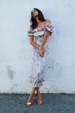 The Lilac Dress is a flirty dress with an off-shoulder ruffle at the neckline and a ruffle at the hem. She is super stretchy and comfy! She is also great for a baby bump! We suggest your normal size or sizing down since she is so stretchy!
