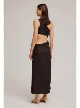 The Draped One Shoulder Cut Out Midi Dress in Black is a dress that can take you from sunset drinks straight to dinner. Made from mid-weight linen, it has a fitted bodice, exaggerated side cutouts, and slits at the side that move beautifully as you walk