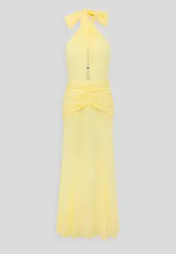 The Halter Neck Cut Out Dress in Pastel Yellow is crafted from cotton. Designed with a straight silhouette and ruching at the hip, it features a halterneck tie, keyhole cut out and an open straight back. Keep your look minimal, and pair it with a barely-there heel.