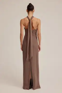 The Silk Scarf Dress in Ink is a sleeveless maxi dress. This minimal silhouette is made from soft silk and is designed with a panelled bodice, detachable scarf, rouleau straps and invisible zip. Keep your look minimal, and pair it with a barely-there heel.