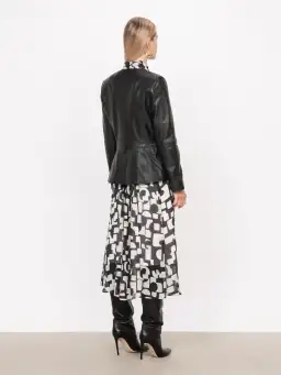 Crafted from panels of soft leather, this slim style jacket is tailored for a sleek finish. Designed with a collarless neckline featuring a tuck, this style is nipped in at the waist to create an hourglass silhouette.