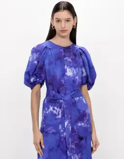 Made from a European satin viscose, this dress features a Clouded Blueprint. The tucks at the sleeves complement the voluminous silhouette that is gently fitted at the waist and has a floaty, midi-length skirt.