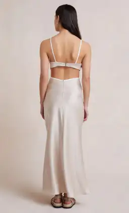 The bias-cut maxi dress with silk contrast strap detail and a statement plunging neckline.