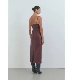 Encapsulating the 90s bombshell, the Espionage Leather Dress is made from genuine leather in a deep burgundy hue. Designed to hug the body, this midi length leather dress features panel detailing and a soft sweetheart neckline for a feminine balance.