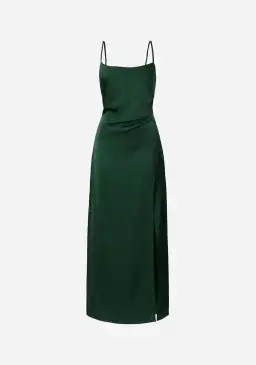 The Immunity Dress introduces an elevated option crafted from our signature cupro fabrication, showcasing a deep green hue. With a soft cowl neckline, this maxi length dress is finished with a soft leg split for added romance and refinement.
