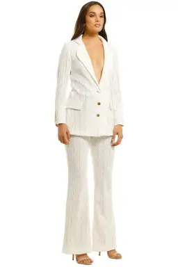 The Marbella Blazer and Pant Set by We Are Kindred offers a feminine twist on the classic masculine blazer. Made from classic white lace, it exudes effortless style. Perfect for work functions, date nights, or races, it features a classic lapel, tailored fit, and front pockets.