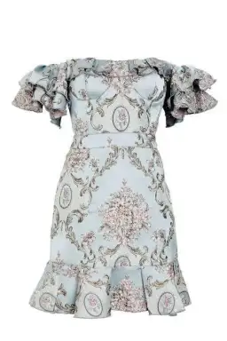 This We Are Kindred dress is sure to stun on any occasion, in a dreamy blue brocade, the fitted bodice features bust cups, a flattering off-the-shoulder neckline, and tiered ruffles. Make it yours to rent for a wedding or cocktail party.