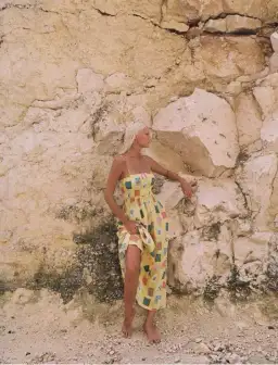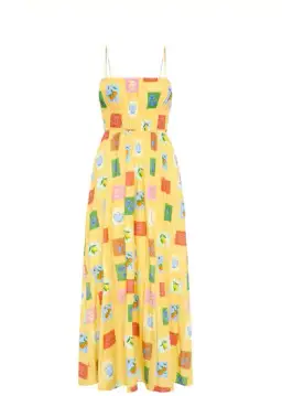 A floaty mid-length skirt and thin shoulder straps for easy wearing. Crafted in 100% Cotton Poplin in our hand-painted Yellow Emblem Print, the West will be a wardrobe favourite.