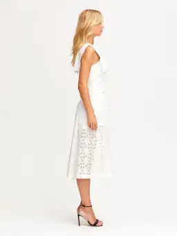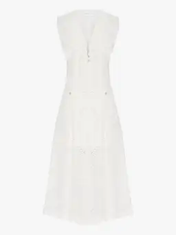 Fitting for a summer in the Hamptons, the Wilde Grotto Midi Dress has been cut from a lightweight broderie anglaise cotton. The understated floral pattern is lined until mid thigh before falling to just below the knees for a modest hem. Two splits at the front provide ease of movement and style nicely with some wedges or tan sandals.