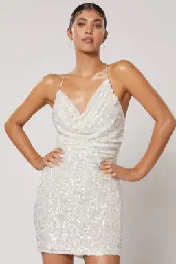 Cowl neckline, adjustable string shoulder straps Mini length. Low scoop back with attached string feature Invisible zip side closure.