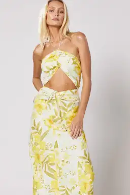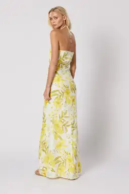 This beautiful floral printed maxi in luxurious linen is your perfect Summer Soirée dress! Front centre cut out with drawstring accents, halter neck with string tie finish. Opening can be adjusted via drawstring so can have less exposed skin. Full length, subtle fluted style skirt with an Invisible zip back closure. Lined throughout the dress.