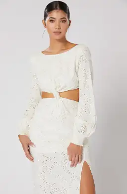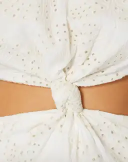 - Front knot detail with side cut out accents. Plunge V back with tie finish