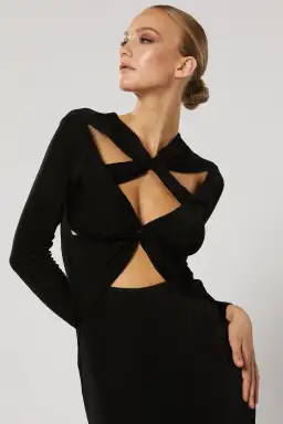 Slinky black midi dress with long fitted sleeves, front cut out accents with twist centre bust-line feature. Invisible zip back closure. Finished in high sheen black textile.