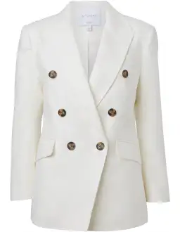 In a tailored fit Double-breasted silhouette with peaked lapels Shoulder pad detail for structured look Crop sleeves with buttoned cuffs Features tortoise buttons Functional flap pockets Centre back vent for ease of movement Crafted from 100% Linen fabrication Fully lined Designed in Melbourne, Australia Dry clean as per the care label