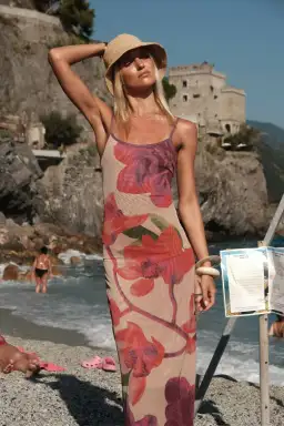 "Our delicate fully lined Slip Dress design encapsulates the very best of chic comfort. Featuring pink and coral hues in our best-selling floral print complimented by an accentuated waistline, adjustable straps, a rear split, all combined to softly skim the body."