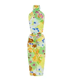 The Naomi Set features a midi length skirt that gathers to the front into a v shape at the waist, the top is a wrap-around scarf style that can be tied in multiple ways.