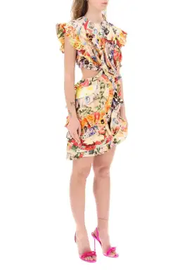Zimmermann mini dress crafted in linen and silk with shiny finish. Characterized by a panel construction with floral motifs and frills all-over, this model boasts crew-neck, butterfly sleeves, double cut-out on the waistband, asymmetrical hem and open back. It features button closure on the upper-back and side invisible zipper and hook fastening. Fitted. The model is 177 cm tall and wears size 1 Zimmermann.