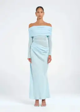 The Yasmin Maxi Dress features a beautiful off-shoulder design with a flattering cowl on the wearers left side waist. The overlapping skirt adds a touch of sophistication while the mesh bodice. Perfect for any special occasion.