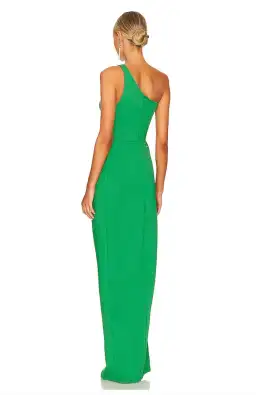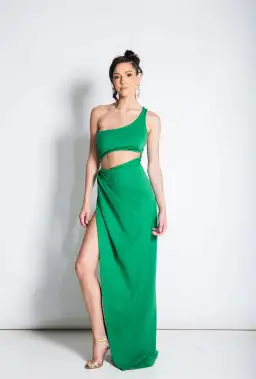 Green One Shoulder maxi dress with waist cut out and thigh split.