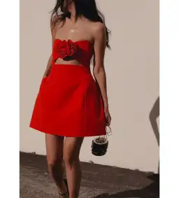 The CUTEST and most flattering little red mini with intricate rose appliqué and a cutout below the bust.