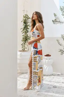 The Capricci Dress in our exclusive Villagio Purple print from our Summer '24 collection. A viscose nylon blend maxi dress with ric rac panels and trim edge detailing, full length skirt and split. Exclusive ZĀCO design.
