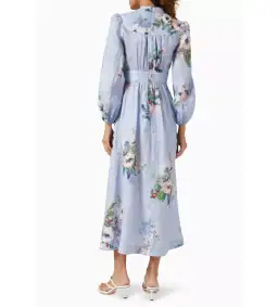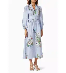 Zimmermann The Everley Plunge Midi Dress in Light Blue Watercolour Floral Size 2/Au 12