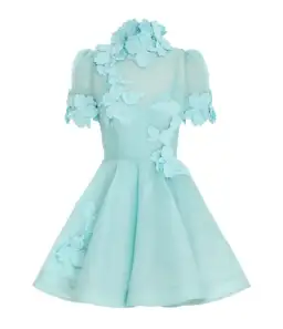 A silk linen mini dress featuring side seam pockets, a crinoline tape hem and sheer bodice, finished with hand applied 3D moulded flowers throughout.