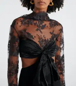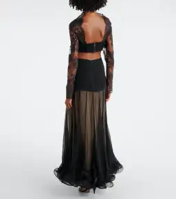 From the Fall 2024 Collection, In Illustration. A silk full-length gown featuring long lace sleeves and a lace bodice with side seam boning and underwire; finished with a self tie centre bust bow.