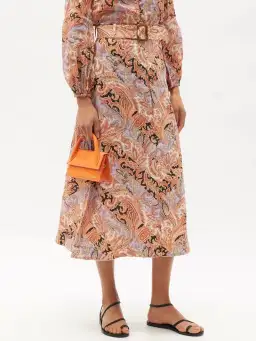 The Botanica Chevron Midi Skirt in Chevron Paisley from Zimmermann's Spring 2021 Collection, Wild Botanica. A linen midi skirt constructed from a chevroned paisley print featuring an A-line silhouette and a removable resin buckle and eyelet belt.